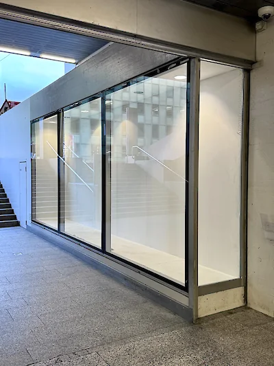 The name is the agenda, the location is the message: The large glass display of ANNAHME is located opposite to the entrance of the former Post office in the "Rostbalken" at SBB, accepting art works of artists.