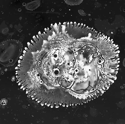 Videoinstallationen transformieren diese Prozesse in sensorische Erfahrungsräume. Auf Membranen in Becken projizierte Flüssigkeiten modulieren auf Frequenzen, sodass Zell-ähnliche Gebilde entstehen, die sich teilen, reorganisieren und stabilisieren. Gleichzeitig werden fotografische Arbeiten aus Tusche- und Acrylexperimenten auf Diaplättchen analog vergrößert und belichtet, wodurch eine Ästhetik entsteht, die an mikroskopische Organismen, fremdartige Lebensformen oder außerirdische Strukturen erinnert. Mikrotopia eröffnet damit einen interdisziplinären Dialog zwischen Kunst, Naturwissenschaft und Wahrnehmung. Die Ausstellung untersucht die Prinzipien von Musterbildung, Wachstum und Fraktalität in der Materie, reflektiert die Beziehung zwischen organischem und artifiziellem System und problematisiert anthropozentrische Perspektiven in der Wahrnehmung von Materialität.