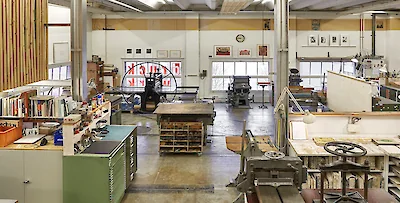 Das Atelier befindet sich im Werkraum Warteck pp. Auf 160m² bietet die Werkstatt Arbeitsplätze und Maschinen für den künstlerischen Hochdruck (Holz- und Linolschnitt, Bleisatz), den Tiefdruck (Radiertechniken) und die Lithografie (Steindruck).