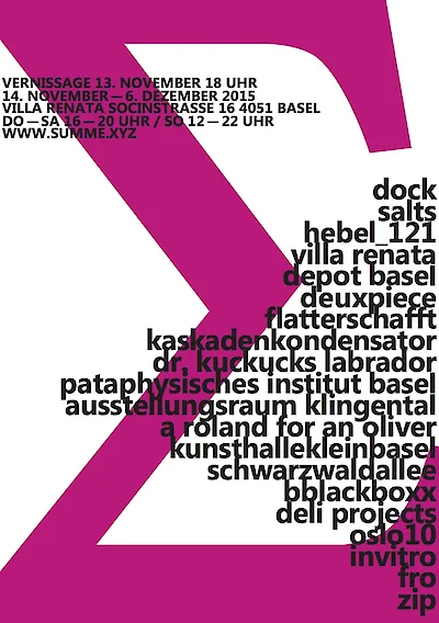 Um dieses Engagement der Basler Projekträume sichtbar zu machen, lud das Künstler_innen-Kurator_innenkollektiv Dr. Kuckucks Labrador ein zur ersten gemeinschaftlichen Ausstellung aller ausserinstitutionellen Kunsträume. Unter dem Titel Σ, die Summe, wurde ihre Arbeit konzentriert zugänglich, ihre Relevanz für das kulturelle Leben in der Stadt sichtbar gemacht und ihre Vernetzung intensivier.