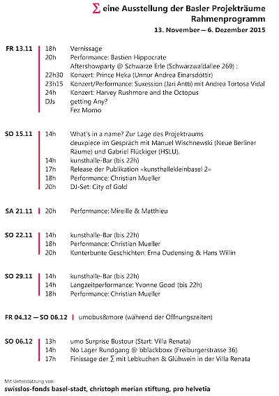 To highlight the commitment of Basel's project spaces, the artist-curator collective Dr. Kuckucks Labrador invited all non-institutional art spaces to participate in their first joint exhibition. Under the title Σ, die Summe (Σ, the sum), their work was made accessible in a concentrated form, its relevance to the city's cultural life was made visible, and their networking was intensified.